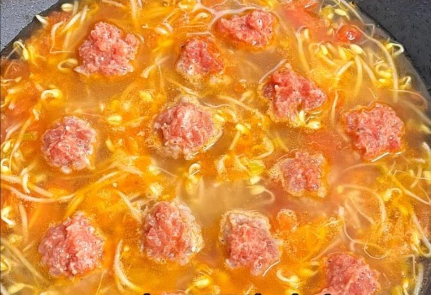 第六步:倒入豆芽炒至变软,加上两大碗清水,把汤品煮一小会儿,然后牛肉馅做成肉丸子,一次性下入锅中,记得不要用汤勺搅动。